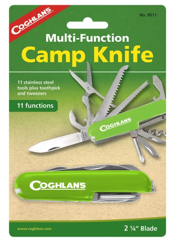 Tools included are: large knifeblade, can opener, scissors, saw, file, fish scaler/hook disgorger, awl, hole punch, corkscrew, Phillips screwdriver, bottle opener/screw-driver, toothpick and tweezers.