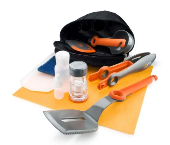 - Includes: Compact Scraper, Scrubby Pad, Cutting Board, Pivot Tongs, Pivot Spoon, Pivot Spatula, Spicer, Soap Bottle, Oil Bottle, Camp Towel, Tote