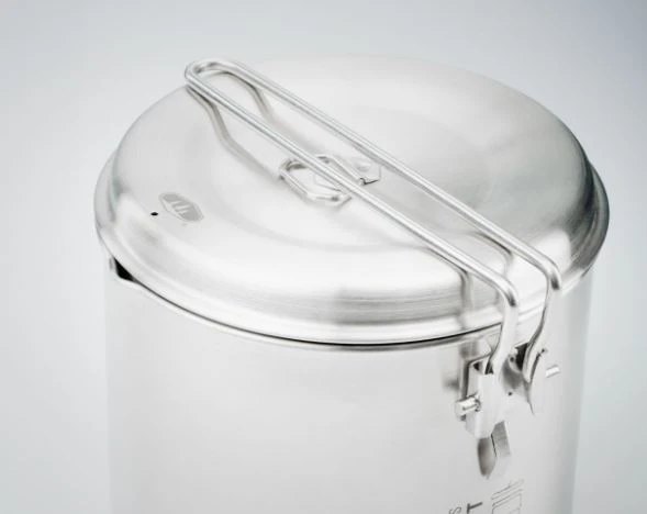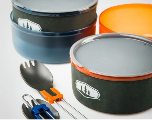 - Two-person system includes: 1.8L pot, strainer lid, two 20oz mugs with insulated sleeves and sip-through lids, two 20oz bowls, two telescoping Foons, welded storage bag/sink