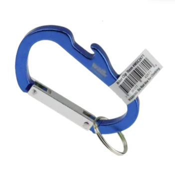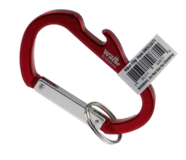 Assorted color carabiner with bottle opener. Colors: orange, red, blue, green, & black
